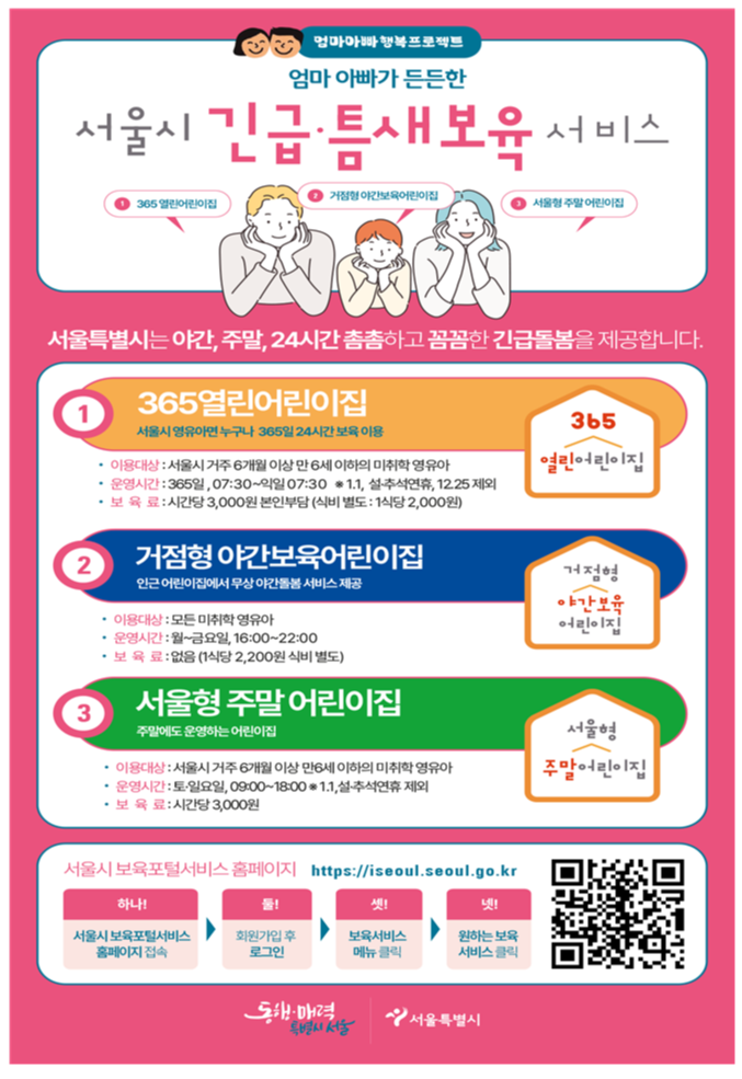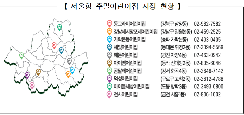 서울시에서 주말에도 어린이집을 운영을 하는 제도를 마련을 하고 있습니다. 맞벌이나 교대근무 자영업자들이 이용할 수 있어서 좋은 반응을 얻고 있습니다. 간호사, 경찰관 같은 교대근무자나 자영업자 등 주말에도 일을 해야 하는 양육자를 위해 토‧일요일에도 아이를 맡길 수 있는 ‘서울형 주말어린이집’이 꼭 필요했던 틈새보육 서비스로 양육자들의 호평을 받고 있습니다. 꼭 필요한 분들이 서둘러 신청해 주기 바랍니다.