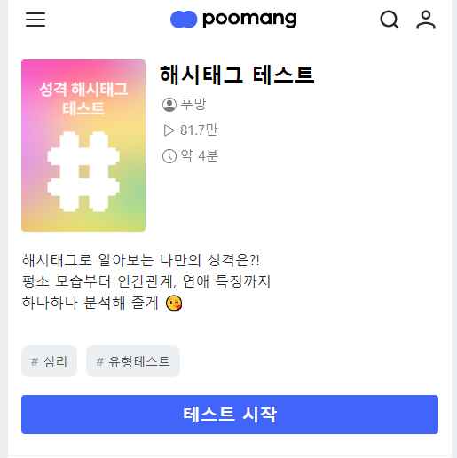 요즘 SNS에서 성격 테스트가 유행이라고 합니다. 한 번쯤 성격 해시태그 MBTI 테스트를 재미 삼아한다고 합니다. 푸망 성격 해시태그 테스트를 소개하려 합니다. 재미있는 성격 해시 테스트를 해보시기 바랍니다. 5분 이내로 성격테스트가 완료되오니 한번 꼭 나의 성격이 어느 유형인지 재미로 알아보세요.