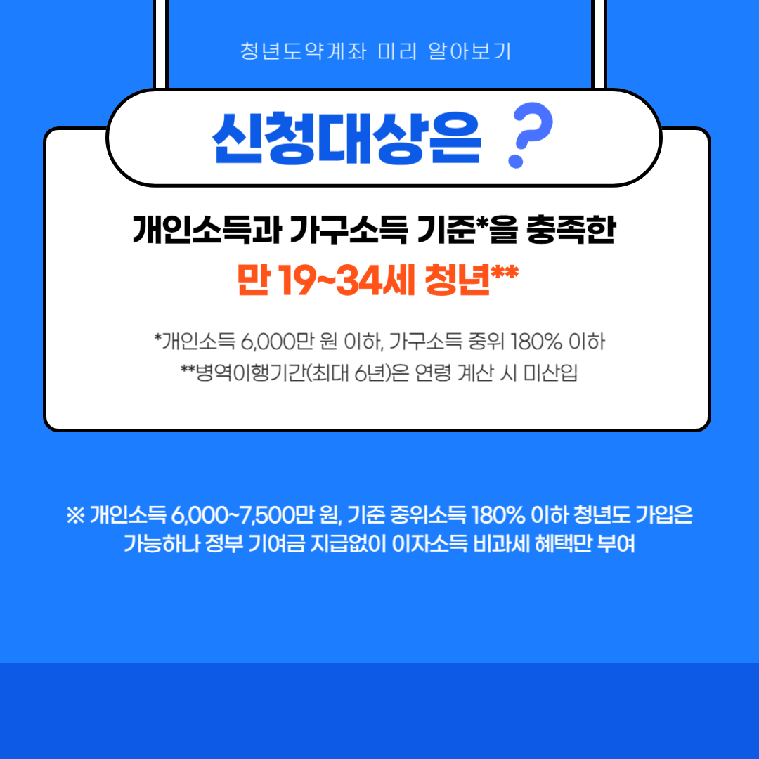 - 취급은행을 통틀어 1명당 1개의 계좌만 가입 가능