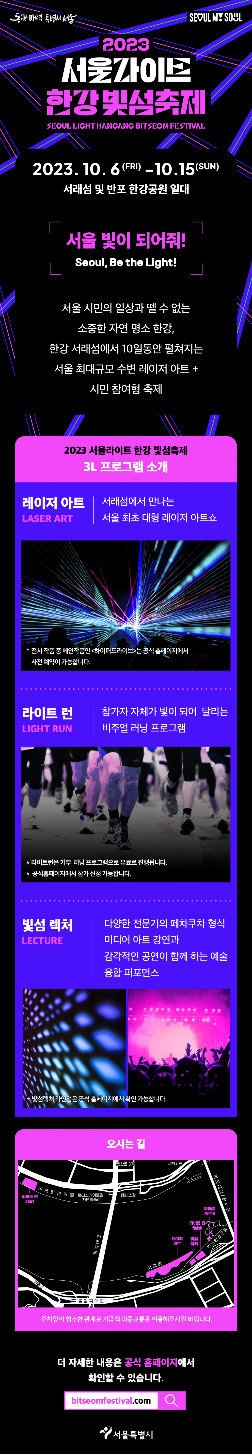개막일인 6일에는 오세훈 서울시장이 빛섬축제 현장을 찾는다. 가수 션과 함께 ‘라이트런(Light Run)’에 참여해 시민들과 한강변을 달리고, ‘빛 섬 렉처(Lecture)’에서는 매니페스토 선언을 통해 미디어아트 랜드마크 조성과 함께 야간경관 활성화로 서울을 ‘빛의 도시’로 만들어나가겠다는 메시지를 전달한다.