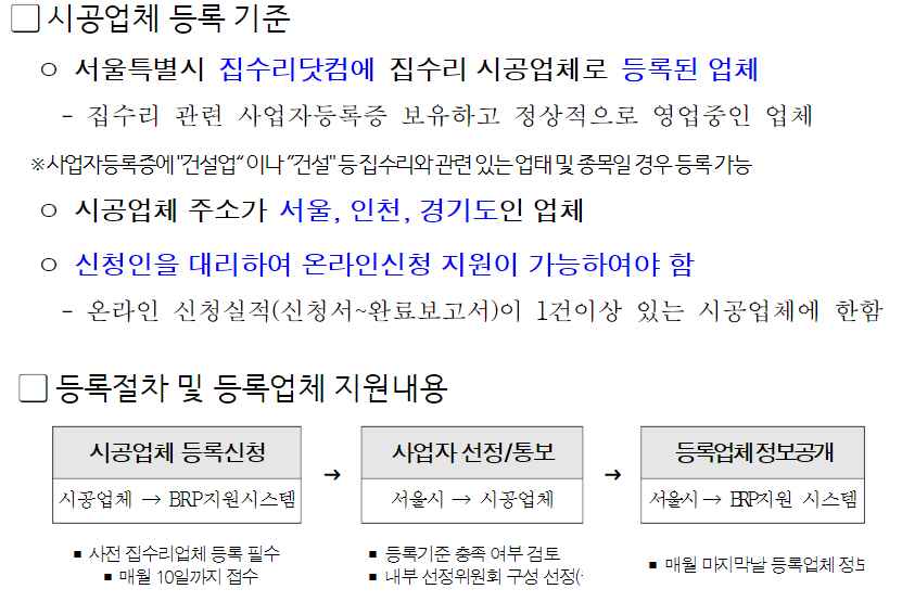 지원을 받기위해서는 시공업체를 알아봐야 합니다. 서울시에서 집수리닷컴에 등록된 시공업체로 연락하면 지원신청부 터 한 번에 도움을 받을 수 있습니다. 신청부터 빠르게 시공까지 가능합니다.
