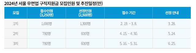 우먼업 구직지원금은 올해 총 3회에 걸쳐 모집하며, 1차 모집(1,300명)은 2월 19일~3월 8일 ‘서울우먼업’ 누리집을 통해 온라인으로 신청을 받는다. 2차 모집은 4월 15일~30일, 3차 모집은 5월 16일~31일로 예정돼 있다.