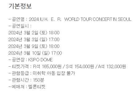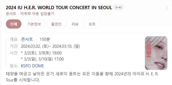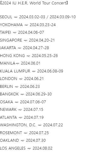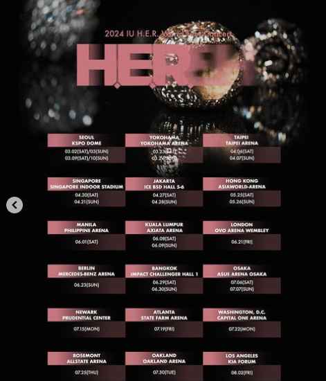2024년 아이유 월드투어 콘서트는 서울을 시작으로 요코하마, 타이베이, 싱가포르, 자카르타, 홍콩, 마닐라, 쿠알라룸푸르, 런던, 베를린, 방콕, 오사카, 뉴어크, 애틀랜타, 워싱턴 D.C, 로즈몬트, 오클랜드, 로스앤젤레스까지 콘서트 예정입니다. 특히, 투어가 지난 2019년 'Love, Poem'이후 약 5년 만에 개최되는 만큼, 새롭게 방문하는 곳도 있어 더욱 눈길을 끌고있습니다. 또한 명칭이 왜 ‘H.E.R.’인지 등 상세 공연소개는 순차적으로 공개될 예정입니다. 아이유 티켓예매 일정과 월드투어 일정을 자세히 알아보겠습니다. 조기마감예정이니 서둘러 예매에 성공하시기 바랍니다.