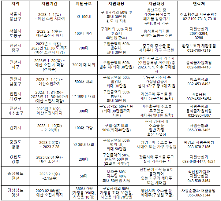 2023년 기준 아래 표와같이 지자체별로 지원금(보조금) 사업을 시행하고 있습니다. 2024년에는 음식물처리기 보조금 사업을 확대하여 더 많은 지원금과 더 많은 지역을 확대하여 사업을 시행할 것으로 예상됩니다. 보조금을 받는 절차는 지자체별로 다릅니다. 구입후 신청하는 곳이 있는가 하면 사전에 상담하고 추첨이나 선정을 통해서 대상자가 된 후 신청 가능한 곳도 있습니다. 하지만 지원금 예산이 한정되어 있는 만큼 해당지역이라 할지라도 반드시 해당 부서에 전화해서 알아보는 것을 추천합니다.